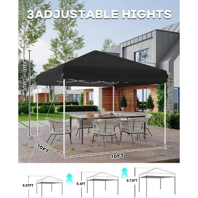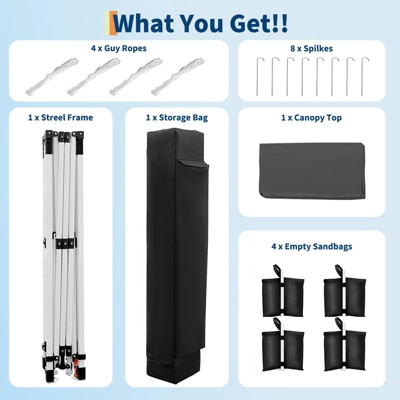10×10 feet pop-up canopy for ample shadeThree adjustable height options for customizable coverageQuick and easy setup—no tools requiredIncludes 4 sandbags to secure the tent in windy conditionsCompact carrying bag for easy transport and storageDurable Gray fabric for UV protection and weather resistancePerfect For:Camping, backyard parties, beach outings, fairs, markets, and any outdoor gatherings.