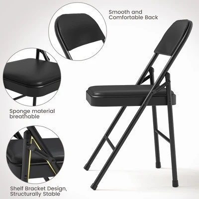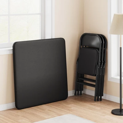 Optimize your dining area with this stylish and practical 3-Piece Folding Dining Table Set, designed to comfortably seat four people. The modern black foldable kitchen table features a sleek faux leather tabletop that’s easy to clean and adds a touch of sophistication. Included are four padded chairs for comfortable seating, all designed to fold for convenient storage when not in use. Its compact, space-saving design is perfect for small dining rooms, apartments, or any area where space is at a premium.