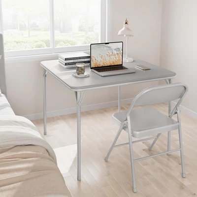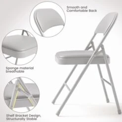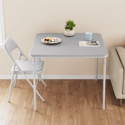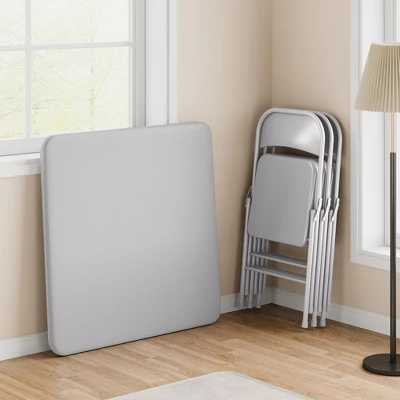 Optimize your dining area with this stylish and practical 3-Piece Folding Dining Table Set, designed to comfortably seat four people. The modern Gray foldable kitchen table features a sleek faux leather tabletop that’s easy to clean and adds a touch of sophistication. Included are four padded chairs for comfortable seating, all designed to fold for convenient storage when not in use. Its compact, space-saving design is perfect for small dining rooms, apartments, or any area where space is at a premium.