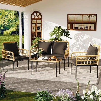 This 4-piece outdoor furniture set includes three casual rattan chairs and a coffee table. The rattan weave with metal frame combines elegant texture with all-weather durability. The compact layout saves space and meets the needs of various scenarios such as leisure alone or gathering with friends. Whether it is a summer party, autumn gathering or afternoon leisure, it can add a warm atmosphere to the balcony, garden, poolside and other environments.