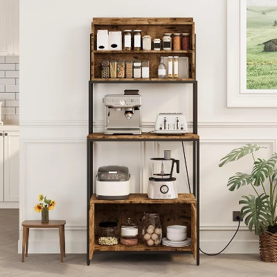 This multifunctional organizer features a spacious countertop for appliances, 3 open shelves, and 2 cabinets for storage. Includes 3 AC outlets with a 4.9ft power cord for kitchen devices. Constructed with industrial metal frames and scratch-resistant surfaces. Functions as coffee bar, bookcase, or display unit. Easy assembly with instructions.