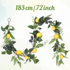 Add a fresh and vibrant touch to your home décor with this 6-foot Artificial Lemon Garland. Featuring realistic lemons, blueberries, lush greenery, and delicate white flowers, this faux vine perfectly captures the essence of summer and spring. Made from high-quality materials, it is durable and lifelike, ideal for decorating front doors, fireplaces, mantels, staircases, and more. Lightweight and flexible, it’s easy to hang or drape, creating a bright and welcoming atmosphere for any space or occasion.