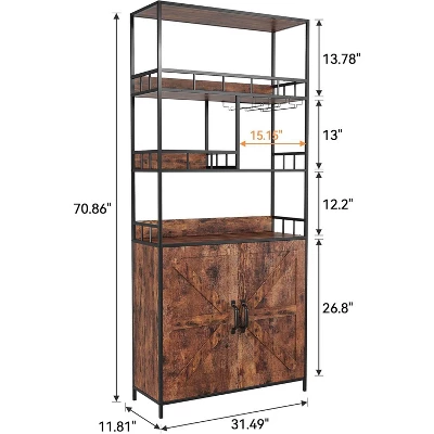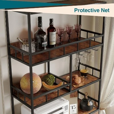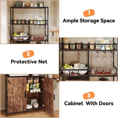 This multifunctional storage unit features open shelves + enclosed cabinet with 150lb capacity. Crafted from MDF and metal frames with protective mesh guards. Includes dedicated wine glass holders and waterproof surfaces. Functions as microwave stand, coffee bar, or pantry organizer. Labeled parts enable easy assembly.