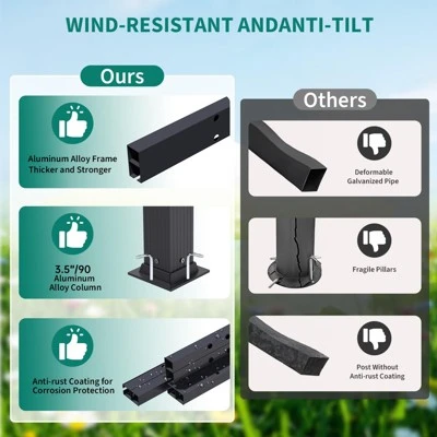 - Commercial-Grade Strength: Engineered with powder-coated aluminum, our weather-resistant pergola withstands rain, snow, and intense sunlight without corrosion. The four-corner reinforced base delivers unmatched stability, keeping the pergola firmly planted during strong winds.