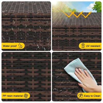 - ćSpacious DesignćWith a generous 80-gallon capacity, this large rattan deck box provides ample space for storing patio cushions, garden tools, pool supplies, and more, keeping your outdoor area organized. This multifunctional deck box bench not only provides storage but also doubles as a patio seat, side table, storage bench, supporting up to 500 pounds for additional seating or as a convenient outdoor furniture piece.